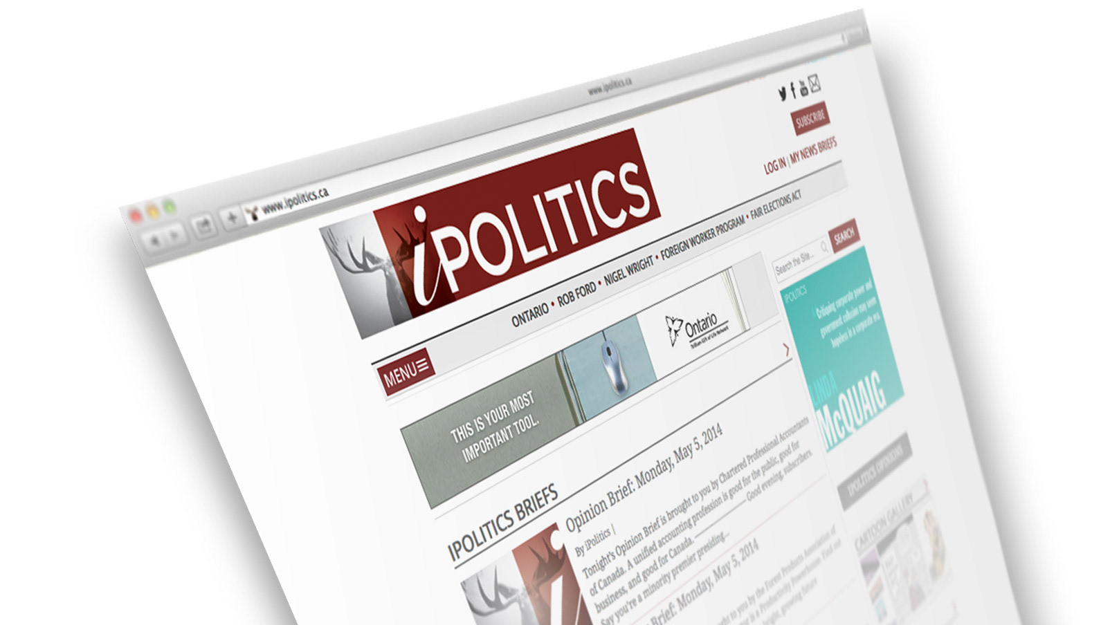 The read all about “it” concept appeared online in the “about us” space of the iPOLITICS.ca site and is a significant first step in a reader-to-subscriber conversion experience. Brand development In concert with a major web site redesign, and inspired by the personalities and vision of iPolitics, LADC redesigned the brand image, site masthead and collateral materials to signal the distinctive nature and independent perspective of iPolitics reporting and opinion.